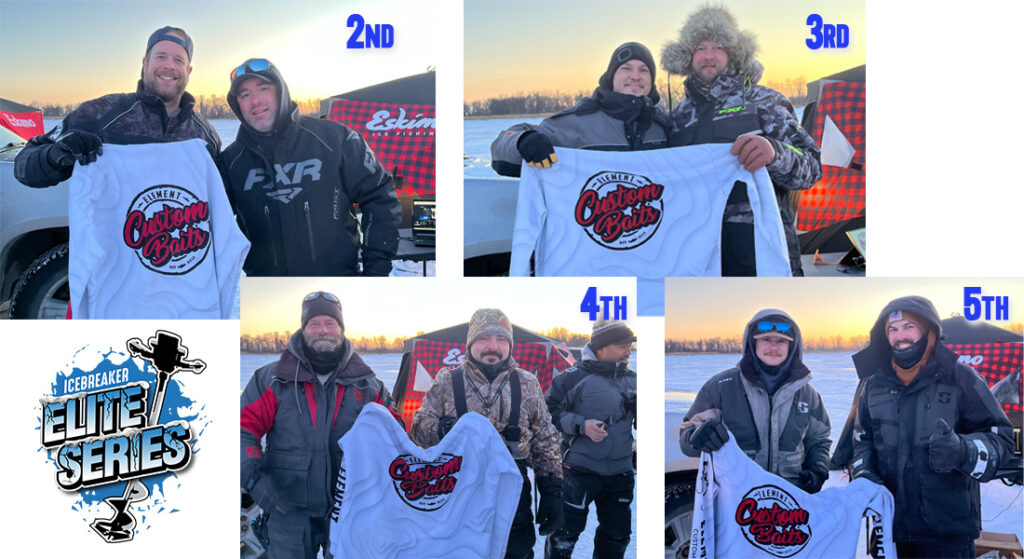 The Top 5 teams at every qualifying tournament win cash. The 6th to 10th place win awesome prize packages, in this event sponsored by returning partner Element Custom Baits. All anglers in the field received Wing Ding and Mug Shot lures as well. Huge thank you to owner Mike Harris for his continued support of the Icebreaker Elite Series. The HuntFishMB Big Fish Award of $250 went to the 32.25″ monster caught by Unrau. It will be very tough to beat for Big Fish of the Year, but certainly not out of reach as the tour moves to vaunted Lake Winnipeg for the next three events.