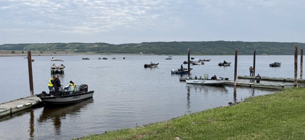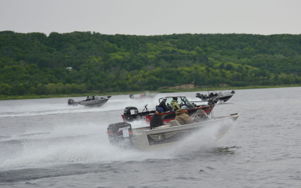 The first of three flights took off down a glass calm Lake of the Prairies on Day 1 Friday morning with subsequent flights taking off in half-hour intervals after. The trademark shotgun start of this tournament is always a sight to see. Armed with serial numbered Judge rulers and Day 1 fish tags that were provided at boat inspection, the teams set out in search of scoring their best two walleye over 55cm (21.75″) via CPR and bringing back three under 45cm (17.75″) slots for live weigh-in.