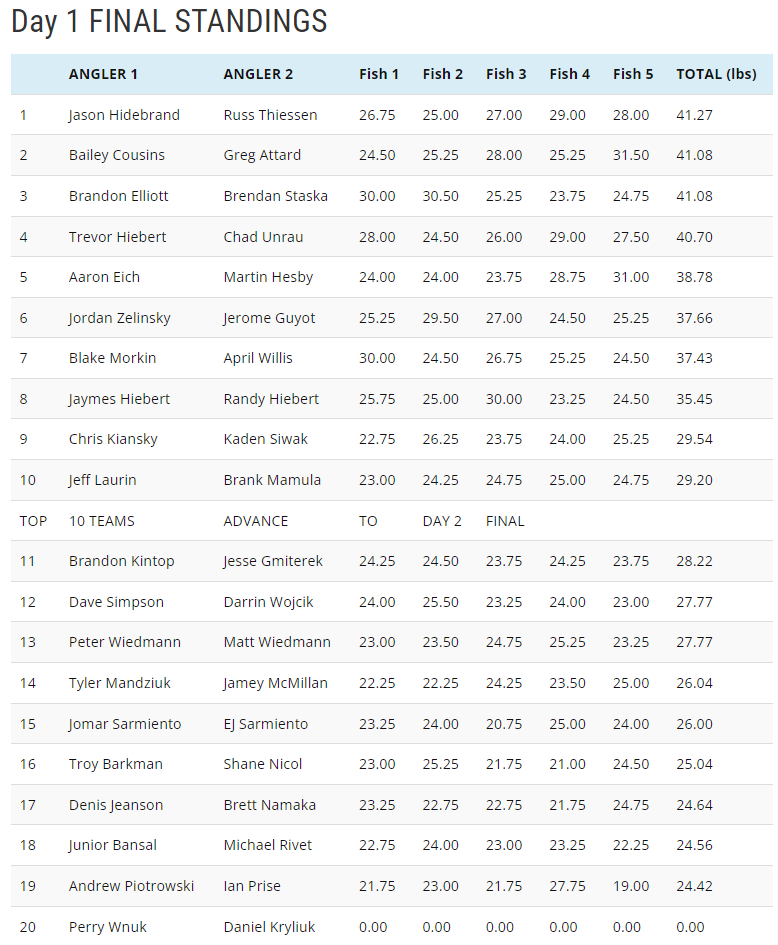 The Top 8 teams ended the day all within striking distance of each other with having at least one Master Angler kicker being the minimum to keep pace. The battle to secure the 9th and 10th spots went down to the wire with a bunch of scores in the final hour. Every team all the way down to 19th place was one hookset away from earning a spot, and a guaranteed cheque, in the Day 2 FINAL. It was truly a battle with multiple teams taking turns being inside the cut line.