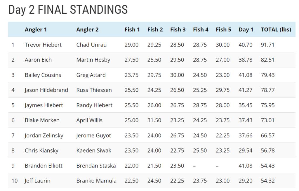 Hiebert/Unrau caught their incredible fourth Master Angler of the day at 1:44pm continuing a record-breaking day for a one-day bag. A seemingly insurmountable lead suddenly became beatable however with all of the late day beasts that were getting caught. Their ‘smallest’ fish was 26 inches and they were now faced with trying to upgrade it to hold the teams below them at bay. At 3:35pm they submitted a 29″ for their ridiculous fifth Master Angler of the day quelling any doubt as to who would be raising the Championship trophy. 40.70 lbs on Day 1 plus a record 51.01 lbs on Day 2 for a two-day Total of 91.71 lbs and a $10,000 cheque.