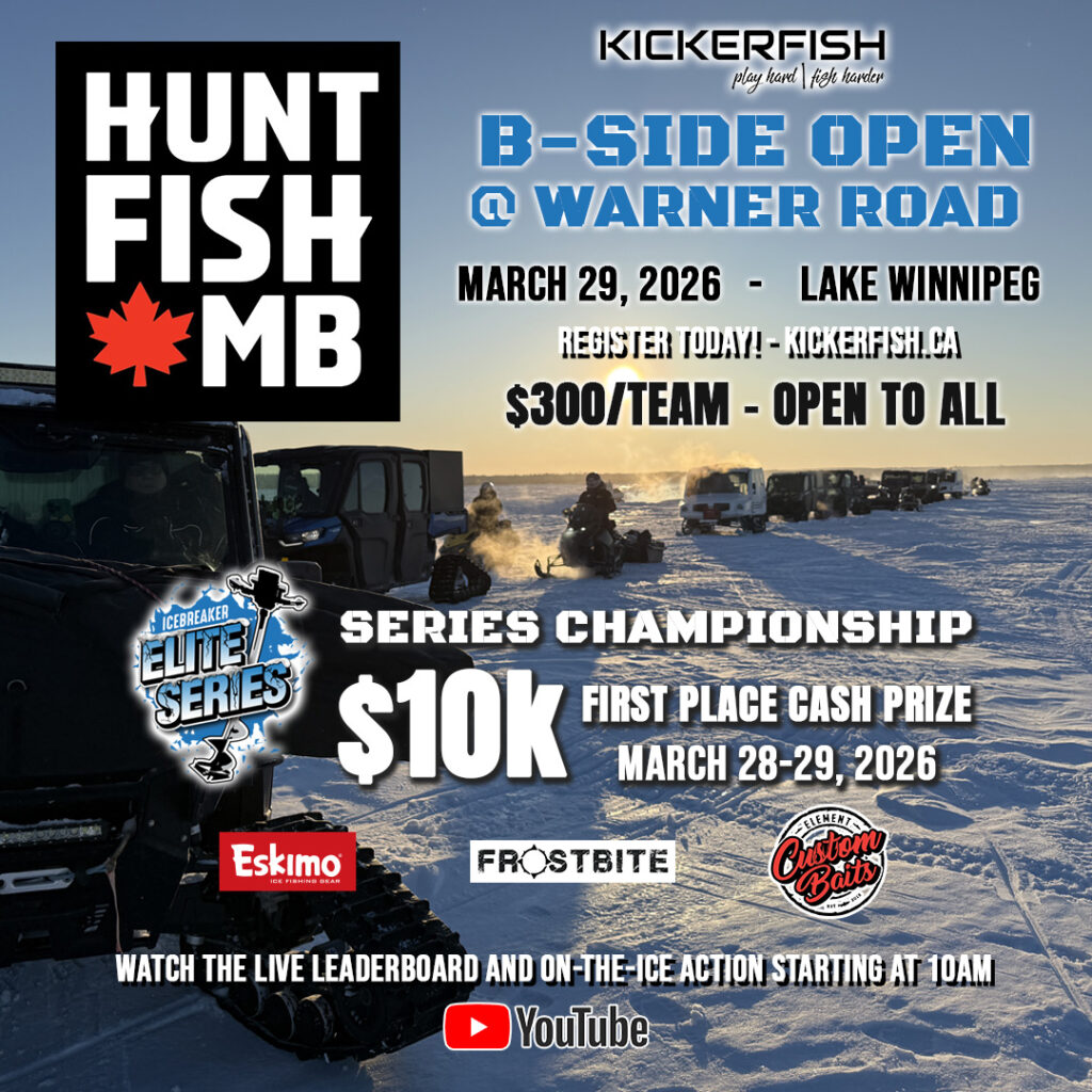 Get in on the hardwater tournament action by joining the the B-Side Open! This one-day open for all to join competition on Lake Winnipeg is an exciting March Madness shootout for cash, prizes, and 2027 Tour Cards!